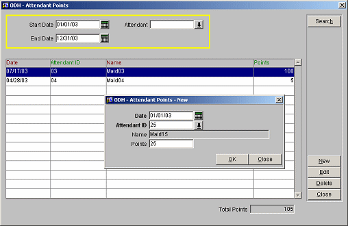 Select New to create a new record to assign points to an attendant, Edit to modify an existing record to adjust any information for an attendant, Delete highlight the entry located in the query grid to remove the record, and Search to display the information requested from the search criteria entered.