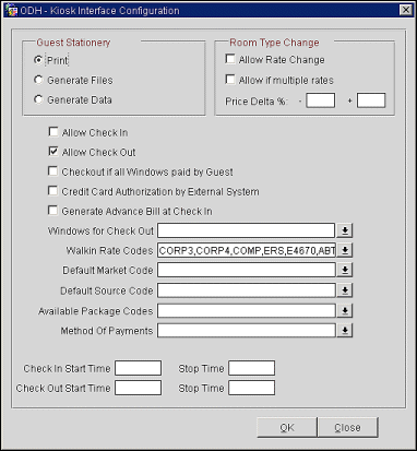 Walkin Rate Codes. This option enables kiosk-processing of walk ins. Up to 10 rate codes can be selected for presentation at the kiosk; only those rate codes having a default market code and source code on their rate header will be available for selection